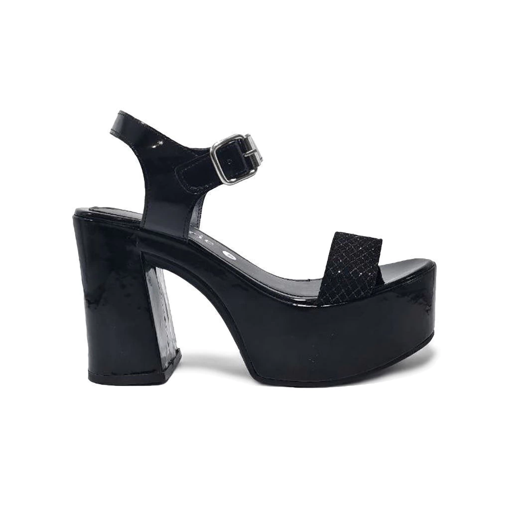 Descripción: Esta sandalia de la marca Cherie es un modelo de plataforma alta con un diseño elegante y llamativo. La sandalia cuenta con un acabado metálico brillante que le da un aspecto sofisticado. Tiene una correa delantera y una correa ajustable con hebilla alrededor del tobillo, ambas adornadas con detalles brillantes que realzan su estilo glamuroso. El tacón y la plataforma son gruesos, proporcionando estabilidad y un toque audaz.