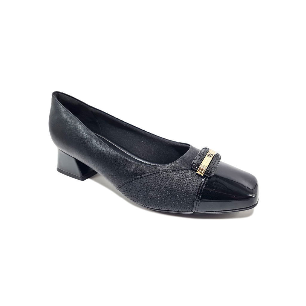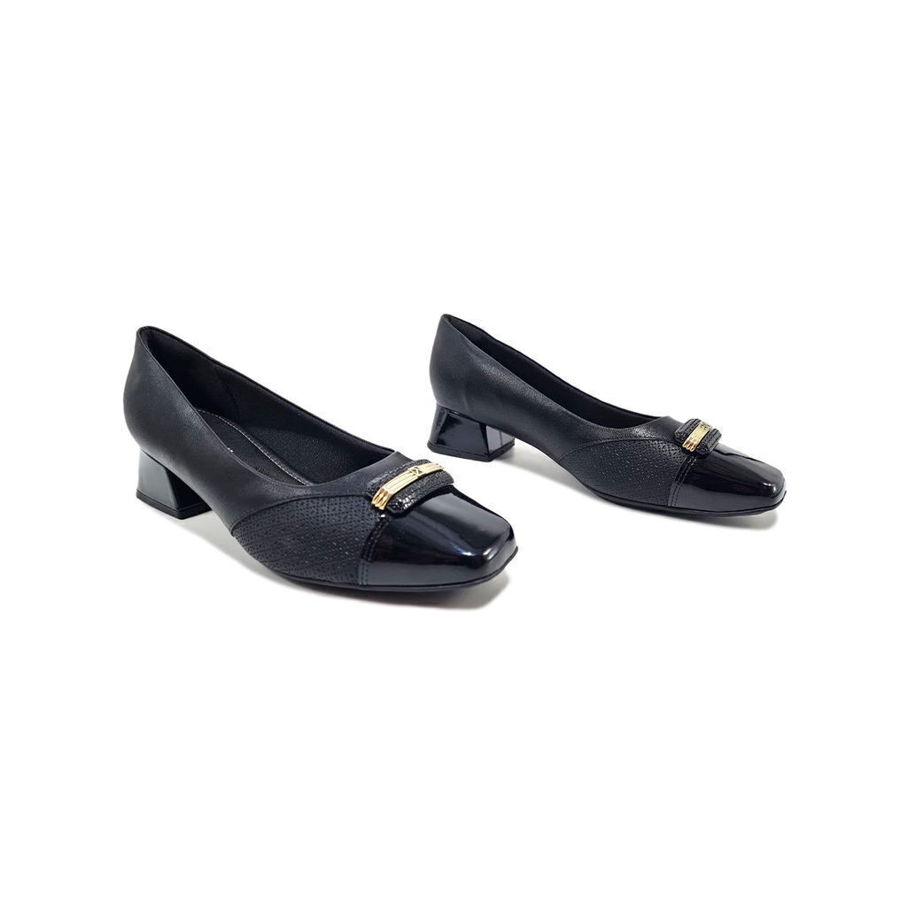 El zapato de la marca Piccadilly para mujer, posee con un tacón bajo y que proporciona estabilidad. El diseño presenta una parte superior texturizada y un acabado brillante en la punta y el talón para contrastar. Un elemento decorativo adorna el área de la punta, agregando un toque elegante al diseño general.