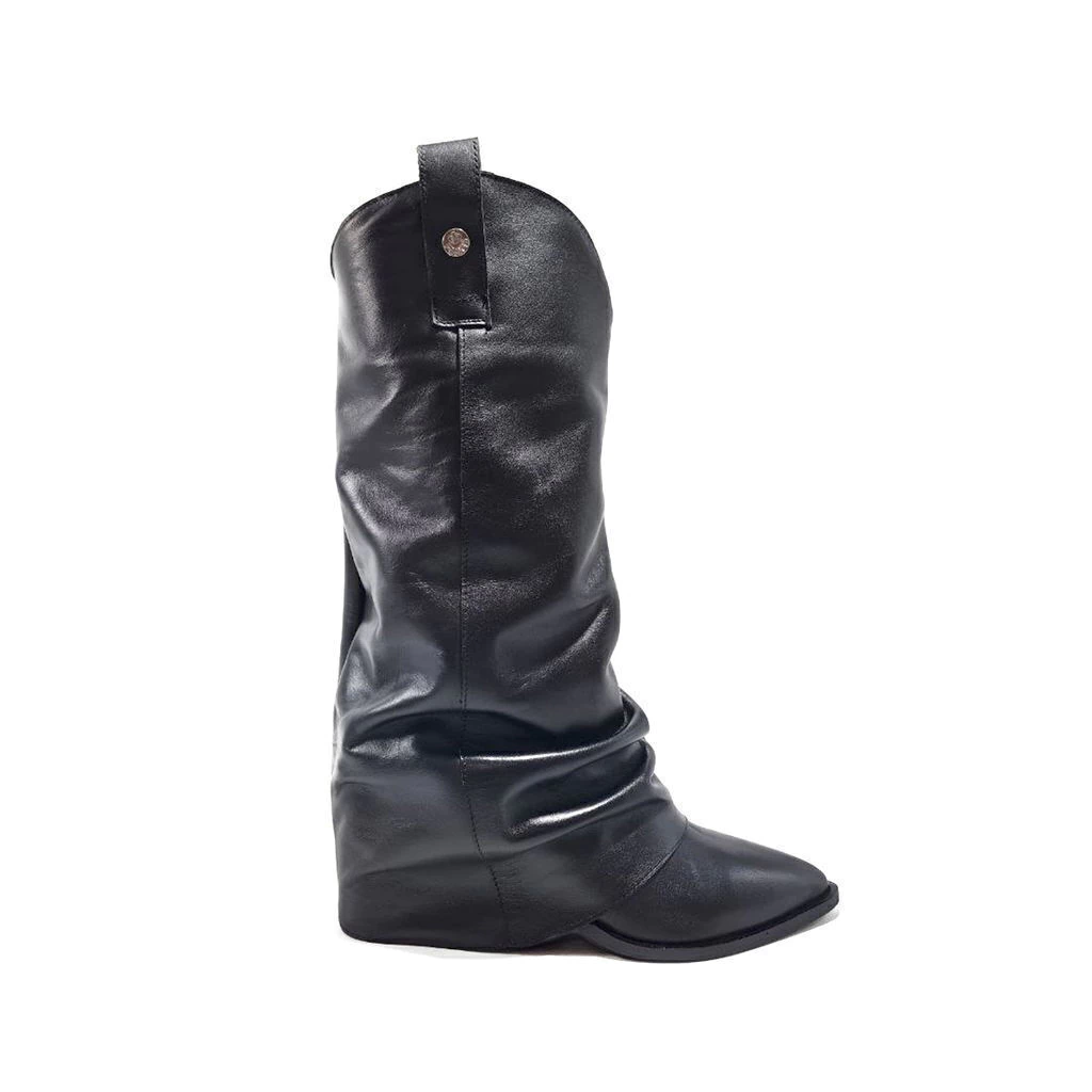 El diseño incluye un acabado arrugado en la parte inferior, que aporta un estilo casual y relajado. La bota cuenta con una punta puntiaguda y un tacón bajo, lo que la hace cómoda para el uso diario. Además, tiene una lengüeta decorativa con un botón metálico en la parte superior, añadiendo un detalle único al diseño.