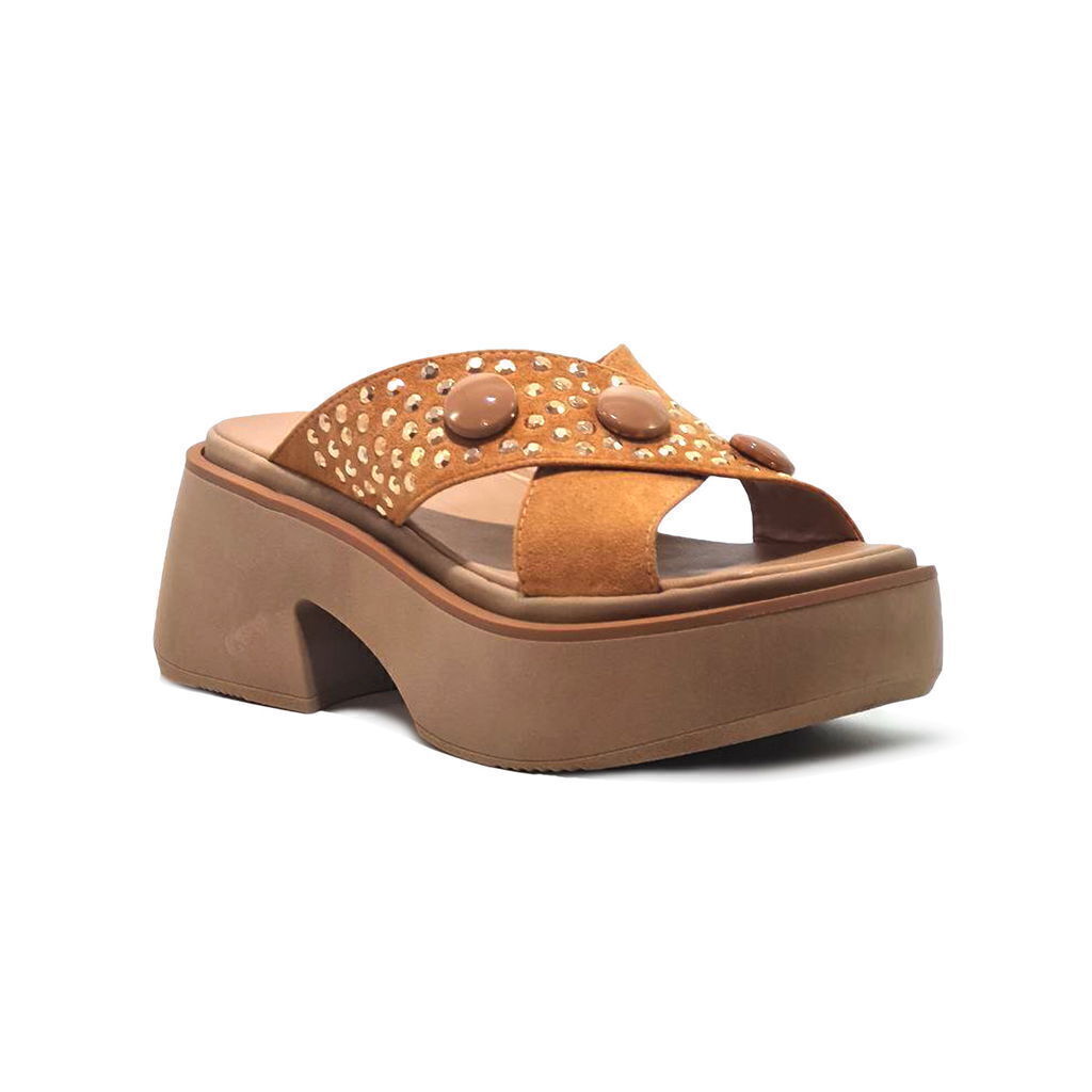 El zueco Duero de Savage es una sandalia de plataforma con una suela gruesa y notable altura. Está coloreada en un tono marrón uniforme. La parte superior del zueco presenta una correa sobre los dedos adornada con tachuelas redondeadas y otra correa que parece asegurar el área del tobillo. El diseño combina elementos de la estética tradicional de los zuecos con detalles modernos como las tachuelas decorativas.